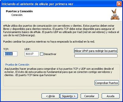 "Iniciando el asistente de eMule por primera vez...") y pulsar el