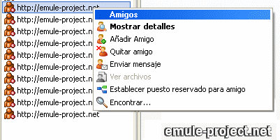La red eDonkey es grande, así que encontrar otra vez a alguien es difícil. La característica Amigos ofrece una manera fácil y conveniente de no perder de vista a la gente con el mismo interés o gustos. Especialmente para grupos con ficheros en lanzamiento esta es una valiosa adición.