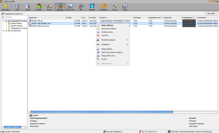 Das Dateienfenster bietet einen Überblick über alle Dateien die du im eD2K- oder KAD-Netzwerk veröffentlich hast.