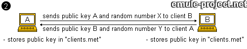 When two encryption supporting clients exchange data for the first time they both send a public key together with a random value to their partner. Each stores the other ones key in its clients.met file. Only the key is saved, the random value is generated new each following connection.