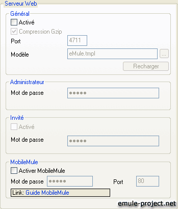 Permet d'établir le mot de passe nécessaire à la connexion. Il est très important d'entrer un mot de passe correct sinon n'importe qui pourra accéder à votre eMule via l'interface web. Le mot entré est masqué sous forme de six étoiles ***. Il n'y a aucun mot de passe par défaut.