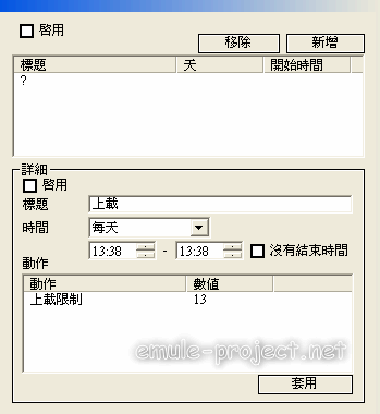 o ®É¶¡ °Ê§@¯à³Q°õ¦æ ¨C¤Ñ ©Î¬O¥u¦³¦b ¤@¶gªº¬Y¤Ñ. ¨CӰʧ@¤]¦³¤@Ó ¶}©l®É¶¡ ©M µ²§ô®É¶¡. °²¦p¦b©Òµ¹ªº®É¶¡¤¤¨S¦³°Ê§@, eMule ·|¦Û°Êªº¨Ï¥Î ¿ï¶µ ¹ï¸Ü²°¤¤ªº¹w³]È.