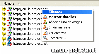 Dependiendo de lo establecido en Preferencias -> Archivos puedes solicitar la lista de los archivos compartidos de un Amigo. Ten en cuenta que la configuración por defecto del eMule para Ver Archivos es denegar esa petición. Si la petición es aceptada, los archivos de este usuario son mostrados en la pestaña de Búsqueda.