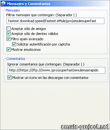 Con el fin de reducir los envíos de spam del sistema Mensajes y hacerlo útil de nuevo, eMule ahora admite el uso de autentificación por Captcha. Si está activado, alguien que envíe un mensaje debe resolver un captcha (una imagen que muestra letras y números) antes de que el mensaje se te muestre. A los clientes antiguos (< 0.49a) que no soportan captchas les será imposible enviarte un mensaje si marcas esta opción y recibirá un aviso sobre ello.
