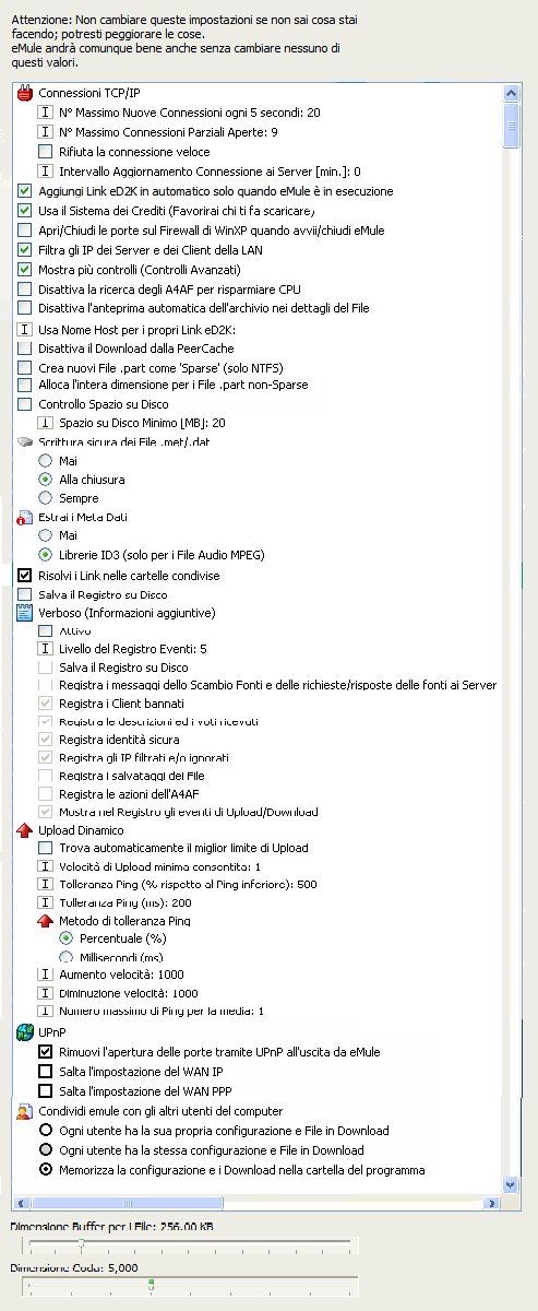 E' importante notare che se cambi queste impostazioni, emule userà altre cartelle per i suoi file di configurazione, causando una "perdita" di tutte le impostazioni. Non vedrai più nemmeno i tuoi download o file condivisi, perchè cambia anche il percorso delle cartelle temp e incoming. Ma naturalmente puoi sempre modificare le opzioni cartelle. Puoi comunque tornare alle vecchie impostazioni/cartelle posizionando il selettore dove stava prima.