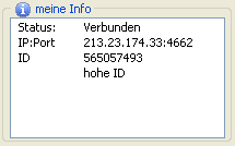Zeigt Dir deine aktuelle ID an. Die ID setzt sich aus der IP- Adresse des Clients zusammen und wird von einem Server nach einer erfolgreichen Verbindung vergeben. Sie dient der Überprüfung, ob Clients fehlerfrei untereinander kommunizieren können.