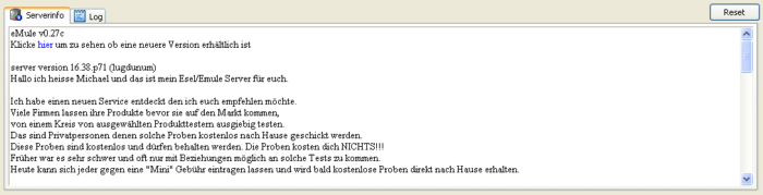 Die ersten beiden Zeilen sind von eMule vorgegeben und zeigen Dir die benutzte Version sowie einen Link an. Der Link führt Dich auf eine Seite die Dir anzeigt ob Du die aktuellste Version benutzt. Solltest Du diese Zeilen nicht mehr finden so liegt das daran das der Text in diesem Fenster zu lang war und die obersten Zeilen gelöscht wurden oder Du hast den Reset- Button benutzt.