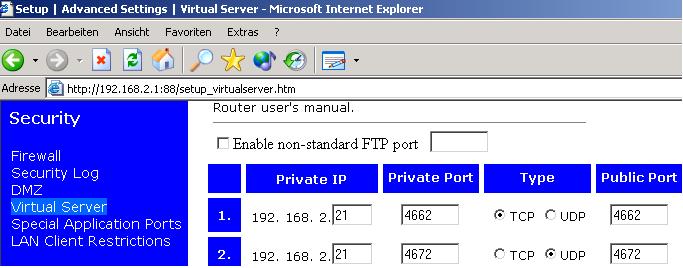 2. Dort unter Setup » "Security" den Eintrag "Virtual Server"