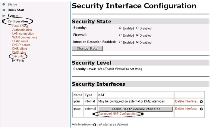 2. Dort unter Configuration » "Security" bei den Security Interfaces unten auf "Advances NAT Configuration" klicken (Die Anzeige kann Modellbedingt abweichen!!!):