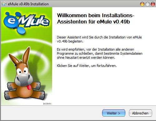 Du kannst eMule in unserem Download Bereich herunterladen. Wenn du eMule zum ersten Mal benutzt solltest du den Installer verwenden da er die einfachste Möglichkeit darstellt eMule korrekt zu installieren und einzustellen. Starte den Installer und folge den Anweisungen. Wenn du unsicher bist was du irgendwo auswählen sollst dann behalte einfach die Standardeinstellung bei; diese wird in den allermeisten Fällen einwandfrei funktionieren.