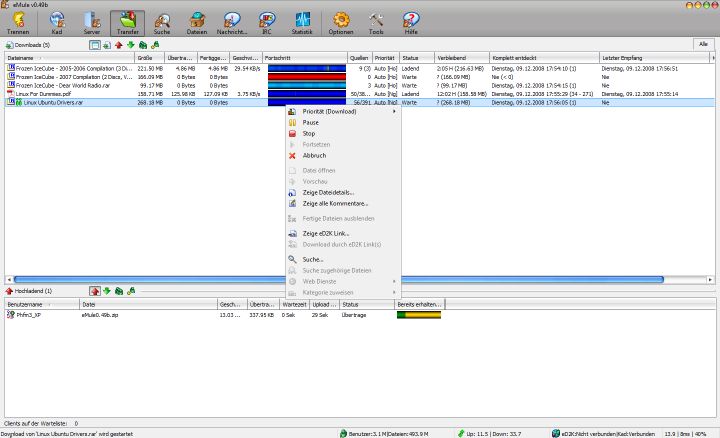 • Erwartet keine extrem hohen Geschwindigkeiten unmittelbar nach dem Start von eMule - es braucht seine Zeit, um genügend Quellen zu finden und sich in den Wartelisten nach vorne zu arbeiten. Je länger eMule läuft, desto besser werden in der Regel auch die Downloadraten.