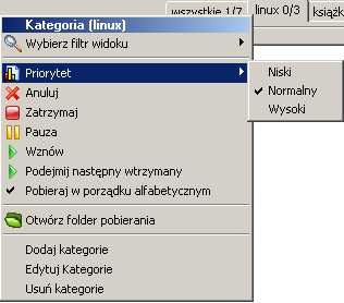 Równie¿ menu kontekstowe kategorii oferuje takie opcje - Priorytet i Pobieraj w porz±dku alfabetycznym.
