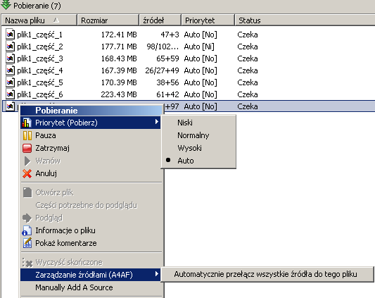Zaawansowane zarz±dzanie ¼ród³ami A4AF w eMule decyduje o tym które pliki najpierw dostan± ¼ród³a w nastêpuj±cym porz±dku: