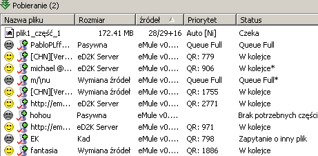 Je¶li plik jest podzielony na mniejsze czê¶ci, eMule poka¿e roz³o¿enie ¼róde³ jak na rysunku powy¿ej dla plik1_czê¶æ_X. Jest bardzo prawdopodobne, ¿e ¼ród³a znalezione dla jednego pliku maj± równie¿ brakuj±ce czê¶ci do innych plików z tej samej grupy. eMule zajmuje tylko jedno miejsce w kolejce klienta st±d du¿a liczba ¼róde³ z Zapytaniem o inny plik.