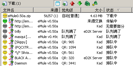 eMule使用了几种不同的手段来寻找下载来源。双击一个下载在展开的来源列表中的大小一栏里可以看到这个来源的获取途径。